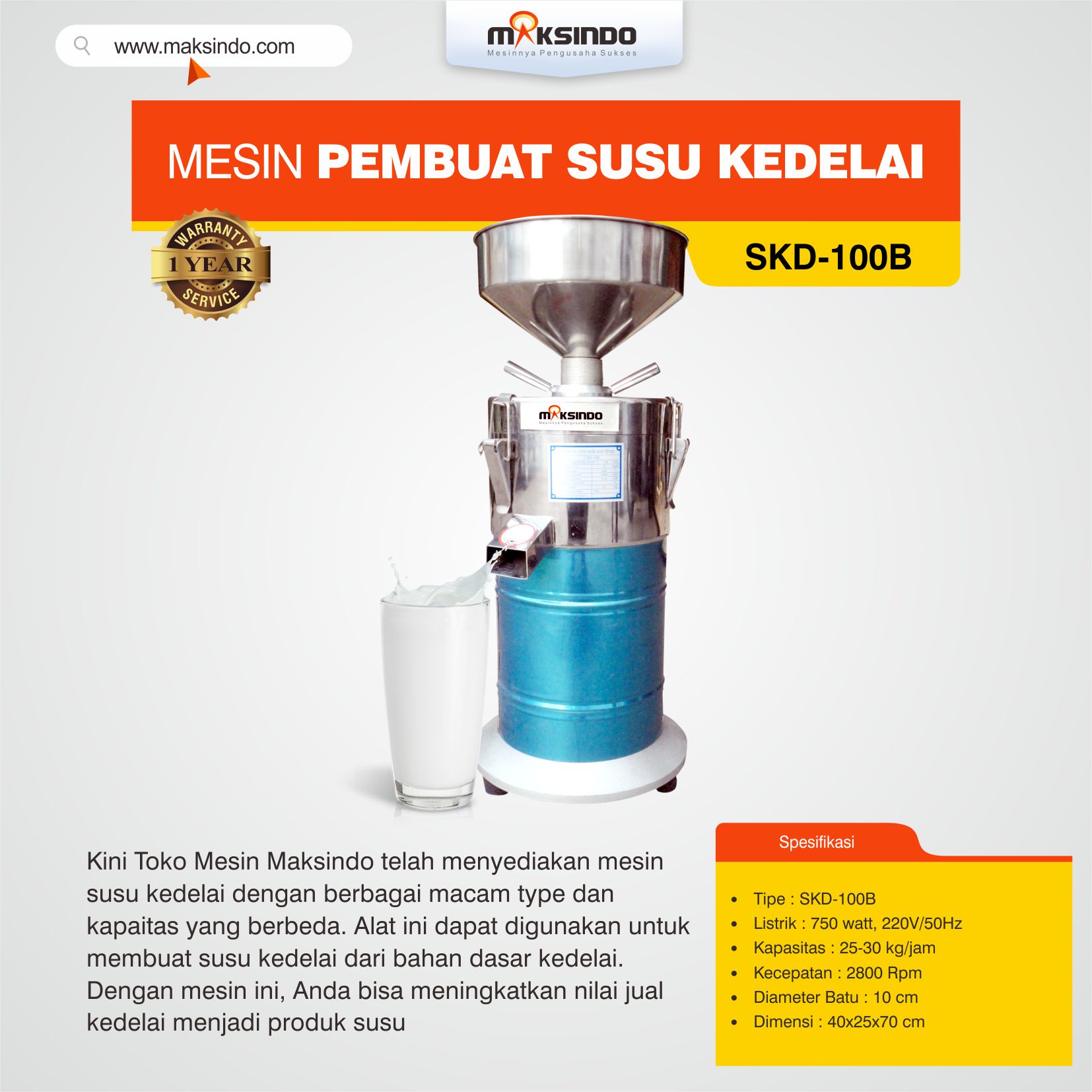 Maksindo kini menyediakan mesin minuman berkualitas yang menguntungkan untuk bisnis. Yakni mesin susu kedelai yang bisa Anda pakai dalam usaha minuman kedelai. Dengan aplikasi mesin susu kedelai maka akan menciptakan susu kedelai dengan cara yang mudah dan gampang. pengoperasian mesin susu kedelai ini sangat membantu dalam proses pembuatan susu kedelai, yang mana proses penggiling kedelai menjadi sari kedelai. Mesin susu kedelai dari maksindo tersedia dengan pilihan tipe SKD-100B. Penggunaan SKD-100B ini dapat digunakan dengan kapasitas pemakaian 25-30 kilogram per jam. Dalam pemakaiannya mesin susu kedelai ini membutuhkan penggunaan listrik 0.75 kW. Desain tampilan mesin susu kedelai ini juga sangat baik dengan bahan material yang berkualitas