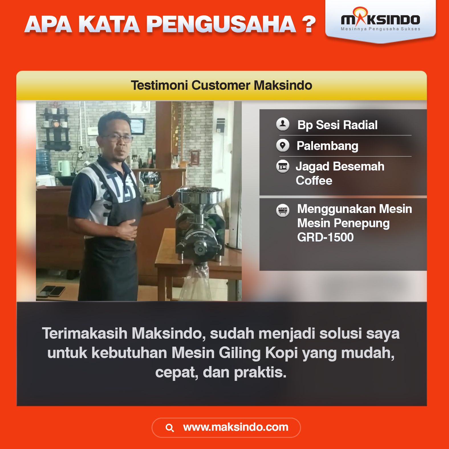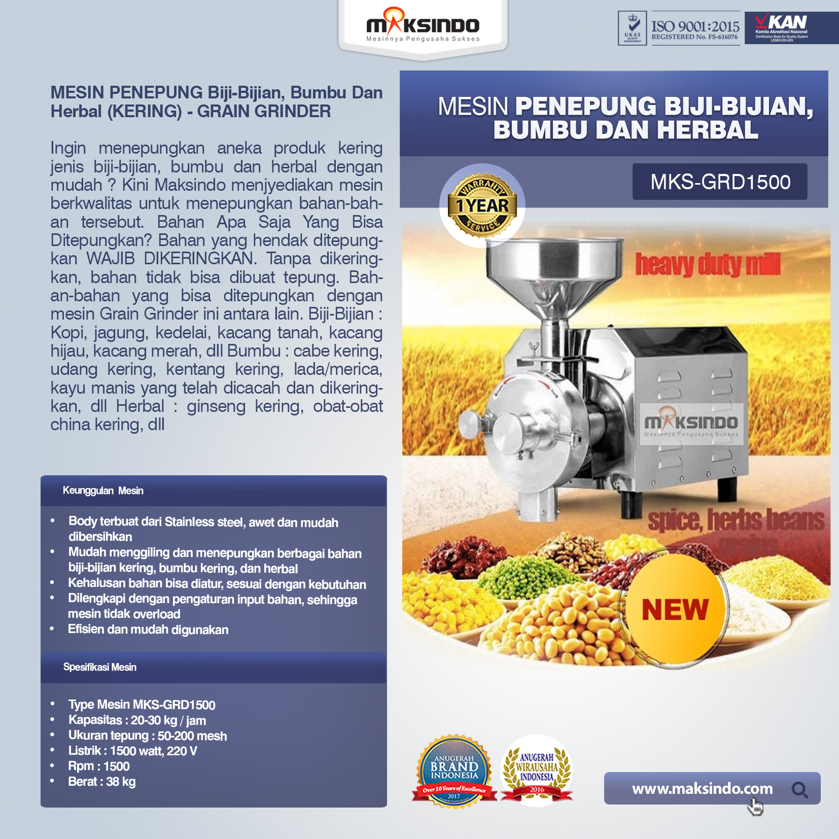 Ingin menepungkan aneka produk kering jenis biji-bijian, bumbu dan herbal dengan mudah ? Kini Maksindo menghadirkan mesin berkualitas untuk menepungkan bahan-bahan tersebut.